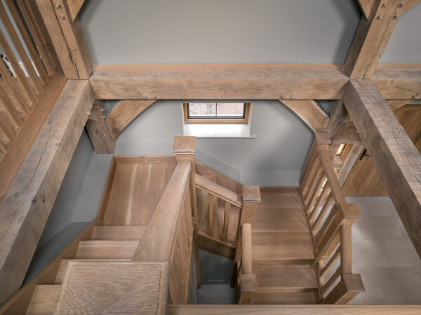 The staircase was manufactured in American White Oak with feature newel posts. The newel posts were custom manufactured with inset grooved panels and intricately moulded newel caps. The customer requested a ‘larger than normal’ specification for the staircase components, so we utilised our 118mm newel posts with a larger 90mm wide handrail. This gives the whole staircase a chunky feel to match in with the large oak beams left exposed within the property.