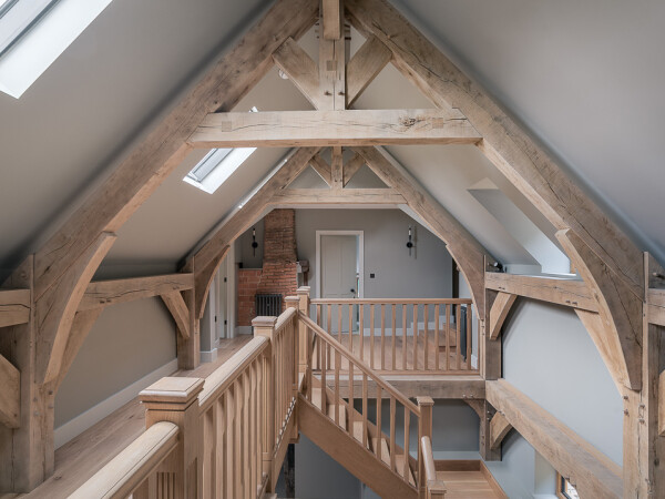 This property recently completed in Thursley incorporates a variety of our Oak products including the American White Oak feature staircase, a beautiful European Oak front door, French doors and window frames.