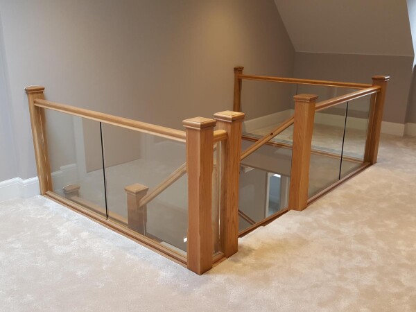 The staircase is manufactured in American White Oak with ‘Stop Chamfered’ newel posts to give a simple, clean look, whilst showing off the beauty of the timber. The glass panels are ‘10mm Clear Toughened Glass’ which give lateral security required for balustrade panels, along with a thin profile to give the staircase a minimal finish.