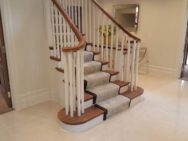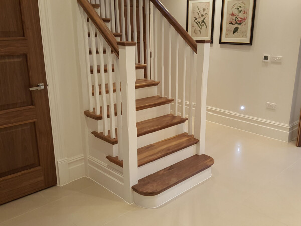 We supplied bespoke timber staircases to all four properties, with Cut String staircases to the detached properties and Closed String staircases to the semi-detached properties. The Cut String flights were a beautiful blend of Walnut and painted Tulipwood, branching between four floors. The handrails were designed and manufactured to match the shape of the staircase starting with bespoke wreathed volutes to both sides of the Ground Floor staircase. The Closed String staircases were manufactured to a similar specification, but the treads and risers where for carpeting.