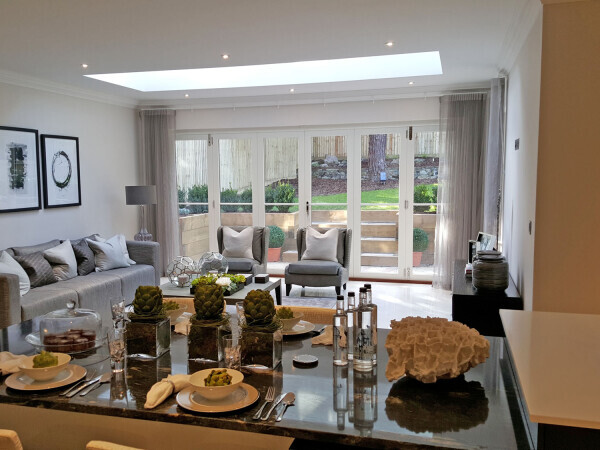 The Kitchen/Living space includes a set of our high performance timber Bi-Folding doors, which opens this spacious area out onto the landscaped garden. There is also a timber Roof Lantern above which floods the space with natural light, creating a perfect place to relax.