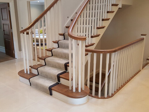 All of the spindles are dovetailed at the bottom end with a matching dovetail housing being cut into the top edge of the treads. This allows the spindles to be securely fixed and screwed into position and the joint covered with a return nosing to create a secure and strong balustrade.
